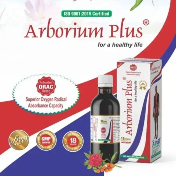 Arborium Plus is an Ayurvedic herbal health supplement produced by Ailvil Healthcare, formulated mainly from Rhododendron and Sea-buckthorn extracts. It is a sugar-free tonic recognized for its strong antioxidant properties and nutrient density, supporting cardiovascular, immune, and nervous system health