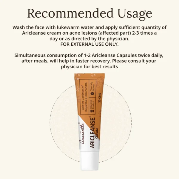Aricleanse Cream is an Ayurvedic formulation that supports skin health and acne . With botanicals like Manjishtha extract and Yashtimadhu extract, it helps reduce breakouts, calm inflammation, and support healthy skin.