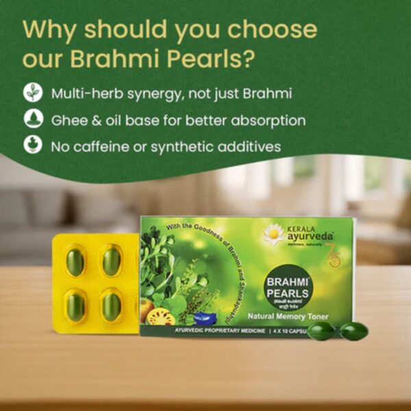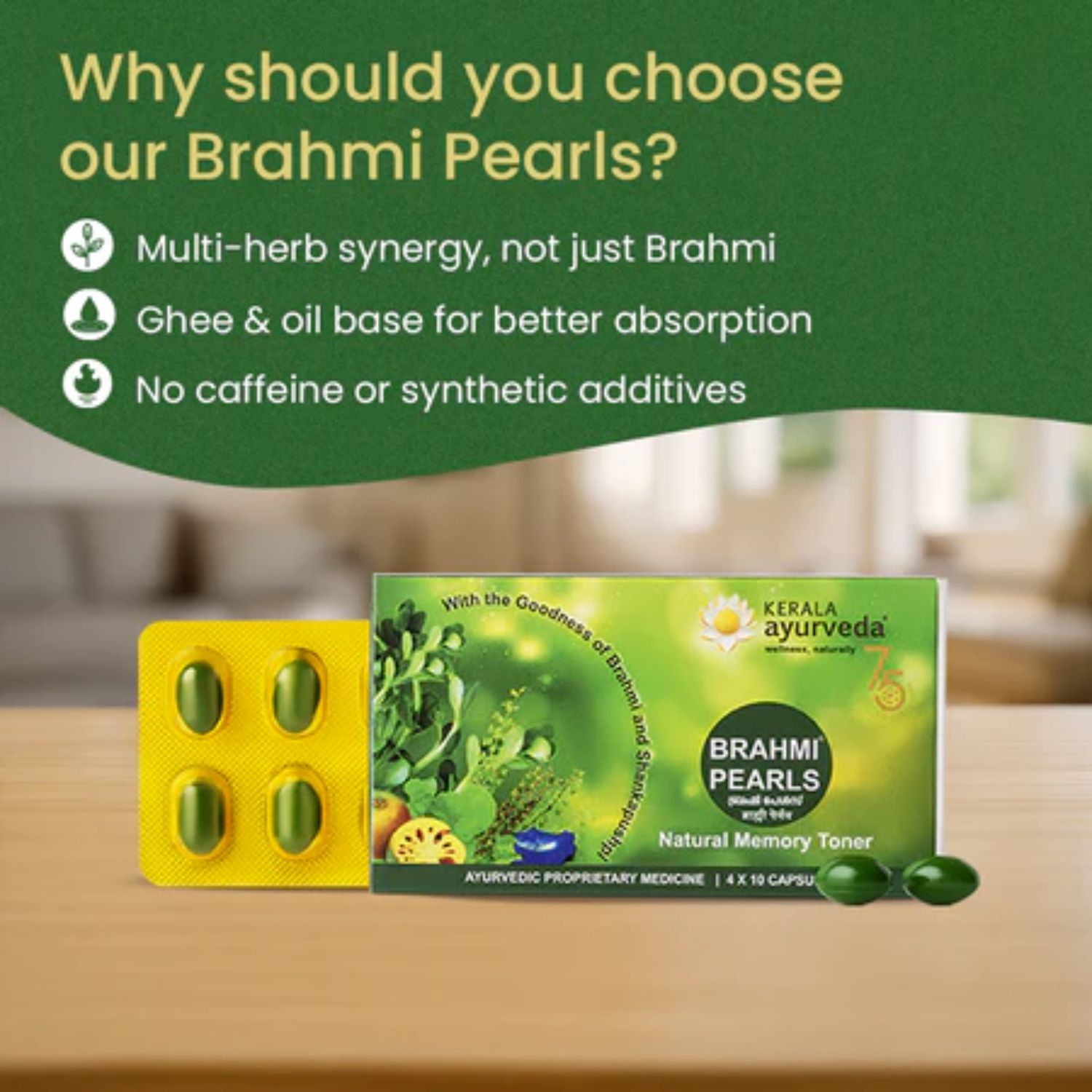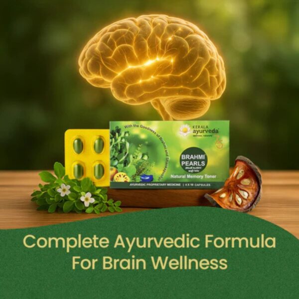 Kerala Ayurveda Brahmi Pearls is a brain nourishing supplement that nourishes, stimulates and tones your brain. Enriched with Brahmi, Mandukaparni and Sankhupusphi, Brahmi Pearls help improve learning, memory, thinking ability and intellect. It also enhances mental clarity, cognitive abilities, reduce stress and promote restful sleep.