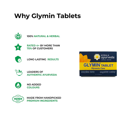 Kerala Ayurveda Glymin Tablet relieves high blood sugar. It acts by renormalizing blood glucose levels and maintaining lipid profile balance naturally.