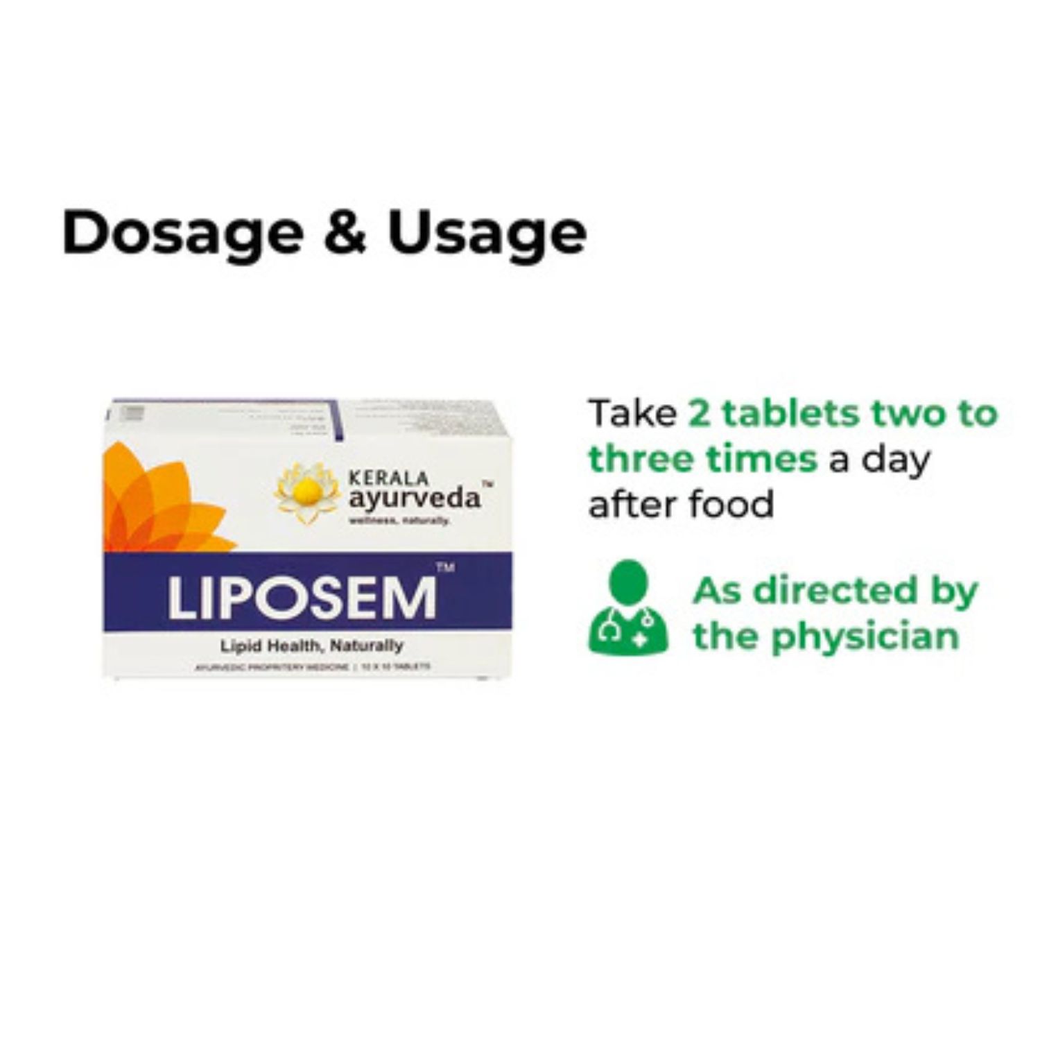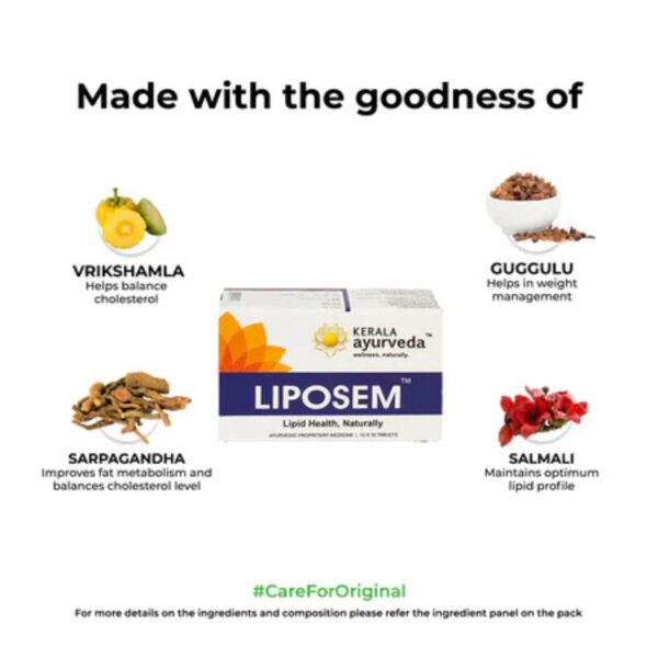 Kerala Ayurveda Liposem tablet is a safe cardio-protective formulation that helps manage cholesterol levels in the body. It also helps manage body weight and minimizes the risk of heart conditions.