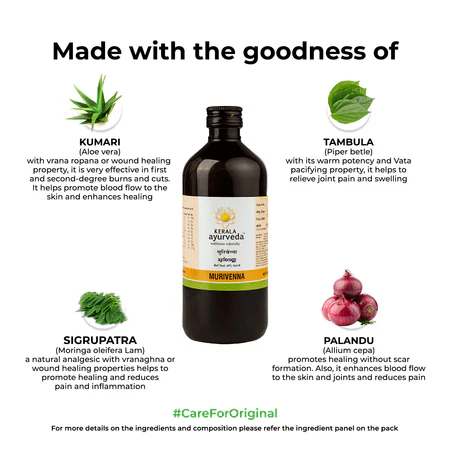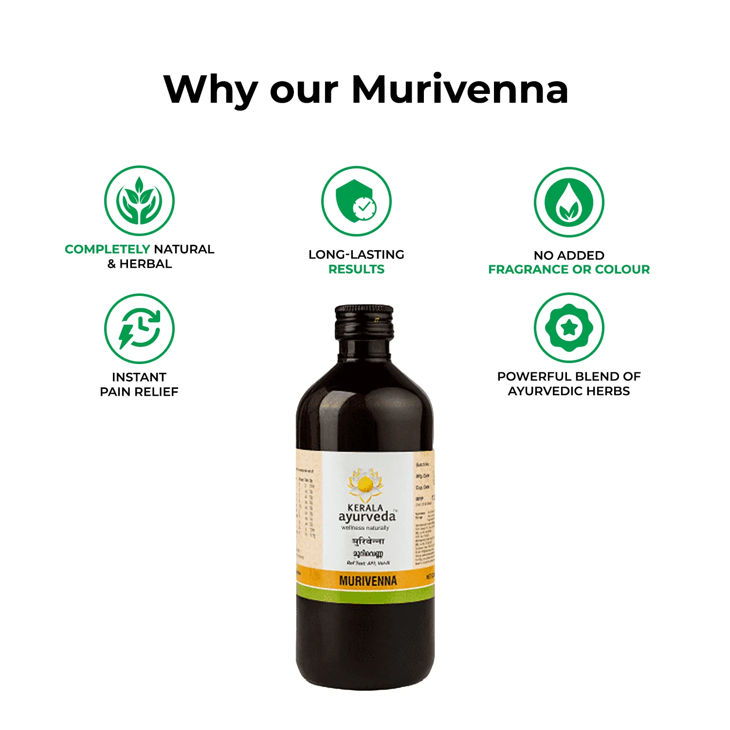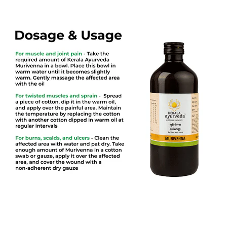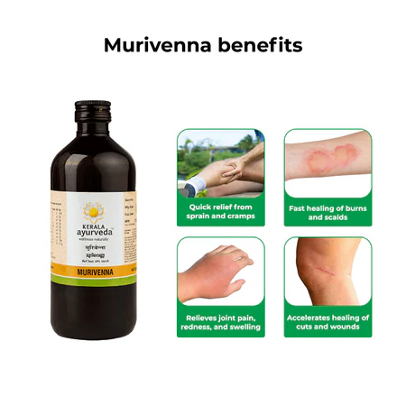 Murivenna from Kerala Ayurveda is an Ayurvedic first-aid oil that helps manage injuries and promote healing wounds. Enriched with betel leaves, Indian shallots, and aloe vera, Murivenna supports bone and joint health and is beneficial in sprains, spasms, and fractures. It also helps accelerate wound healing and fast relief in superficial burns, bruises, cuts, and wounds.