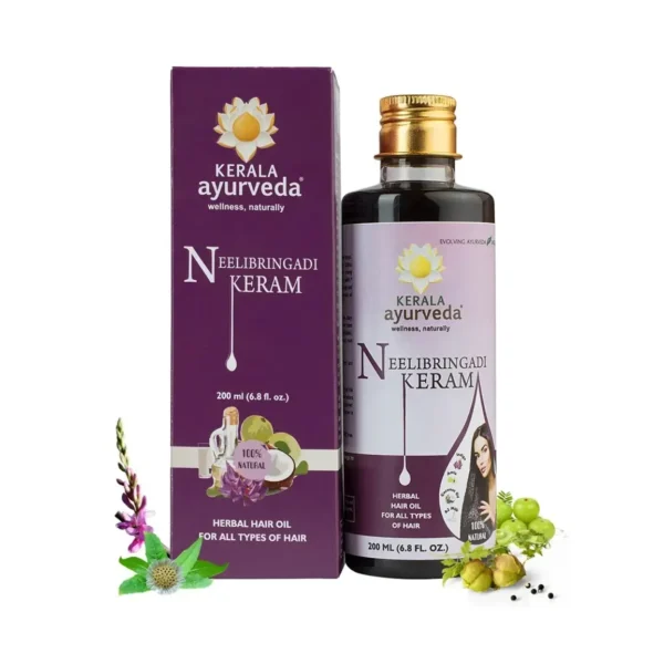 Kerala Ayurveda Neelibringadi Keram is a luxurious Ayurvedic hair oil that promotes hair growth and improves hair quality. Infused with the goodness of Neeli, Bhringaraja, Amla, and nourishing milk, Neelibringadi Keram helps reduce hair fall and minimizes premature greying of hair and dandruff. It also minimizes split ends, calms the mind, and is beneficial in curing male pattern baldness.